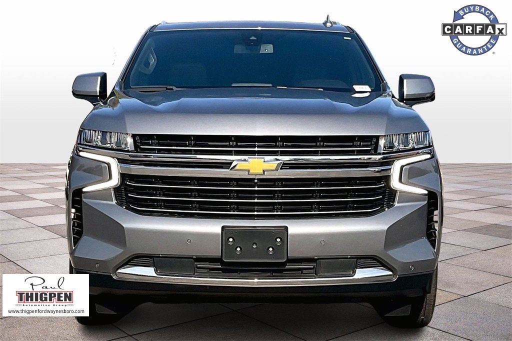 Certified. Satin Steel Metallic 2022 Chevrolet Tahoe LT 4WD 10-Speed Automatic with Overdrive EcoTec3 5.3L V8 Ford Blue Certification Certified, 4WD, Black Leather, 10-Way Power Driver & Passenger Seat Adjusters, 1st & 2nd Row Color-Keyed Carpeted Floor Mats, 2nd Row Pwr Release 60/40 Split-Folding Bench Seat, 3.23 Rear Axle Ratio, 3rd Row 60/40 Power-Folding Split-Bench Seat, 3rd row seats: split-bench, 4-Wheel Disc Brakes, 9 Speakers, ABS brakes, Air Conditioning, Alloy wheels, AM/FM radio: SiriusXM with 360L, Apple CarPlay/Android Auto, Auto High-beam Headlights, Auto-Dimming Inside Rear-View Mirror, Auto-dimming Rear-View mirror, Automatic Stop/Start, Automatic temperature control, Bose 9-Speaker Stereo Audio System Feature, Brake assist, Bright Front & Rear Door Sill Plates, Bumpers: body-color, Color-Keyed Carpeting Floor Covering, Compass, Delay-off headlights, Driver & Front Outboard Passenger Airbags, Driver Alert Package, Driver door bin, Driver vanity mirror, Dual front impact airbags, Dual front side impact airbags, Electronic Stability Control, Emergency communication system: OnStar and Chevrolet connected services capable, Enhanced Driver Information Center, Floor Console w/Storage Area, Four wheel independent suspension, Front anti-roll bar, Front Bucket Seats, Front Center Armrest, Front dual zone A/C, Front High-Back Reclining Bucket Seats, Front reading lights, Fully automatic headlights, Garage door transmitter, Hands-Free Rear Power Programmable Liftgate, HD Surround Vision, Heated 2nd Row Outboard Seats, Heated door mirrors, Heated Driver & Front Passenger Seats, Heated front seats, Heated Steering Wheel, Illuminated entry, Infotainment Display, Lane Change Alert w/Side Blind Zone Alert, Leather steering wheel, Leather-Appointed Seat Trim, Leather-Wrapped Steering Wheel, LED Daytime Running Lamps, License Plate Front Mounting Package, Low tire pressure warning, Luxury Package, Memory seat, Memory Settings, Memory Settings for Driver, Navigation System, Not Equipped w/Front & Rear Park Assist, Not Equipped w/Heated Rear Outboard Seats, Not Equipped w/Heated/Ventilated Front Seats, Not Equipped w/Steering Column Lock, Occupant sensing airbag, Outside Heated Power-Adjustable Mirrors, Outside temperature display, Overhead airbag, Overhead console, Panic alarm, Passenger door bin, Passenger vanity mirror, Power door mirrors, Power driver seat, Power Liftgate, Power passenger seat, Power Release 2nd Row Bucket Seats, Power steering, Power Tilt & Telescopic Steering Column, Power windows, Preferred Equipment Group 1LT, Premium audio system: Chevrolet Infotainment System 3, Premium Smooth Ride Suspension, Radio: Chevrolet Infotainment 3 Premium System, Rain sensing wipers, Rear air conditioning, Rear anti-roll bar, Rear Cross Traffic Alert, Rear Pedestrian Alert, Rear reading lights, Rear seat center armrest, Rear window defroster, Rear window wiper, Remote keyless entry, Remote Start, Roof rack: rails only, Security system, SiriusXM Radio w/360L, Speed control, Speed-sensing steering, Split folding rear seat, Spoiler, Start/Stop System Disable Button, Steering wheel mounted audio controls, Tachometer, Telescoping steering wheel, Tilt steering wheel, Traction control, Trip computer, Universal Home Remote, Variably intermittent wipers, Voltmeter, Wheels: 18" x 8.5" Bright Silver Painted Aluminum, Wireless Charging, 4WD, Black Leather.