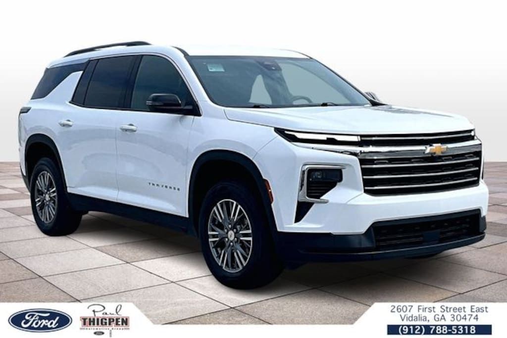 Vidalia Ford Lincoln 2607 E 1st St Vidalia, Georgia 30474 912-788-5318 Preferred Equipment Group 2LT, Ford Blue Advantage: Blue Certified Certified, AWD, 3rd row seats: split-bench, 4-Way Manual Front Passenger Seat Adjuster, 4-Wheel Disc Brakes, 6 Speakers, 6-Speaker Audio System Feature, 8-Way Power Driver Seat Adjuster, ABS brakes, Air Conditioning, Alloy wheels, AM/FM radio: SiriusXM with 360L, Apple CarPlay/Android Auto, Auto High-beam Headlights, Automatic temperature control, Brake assist, Bumpers: body-color, Child-Seat-Sensing Airbag, Compass, Delay-off headlights, Driver door bin, Driver vanity mirror, Dual front impact airbags, Dual front side impact airbags, Electronic Stability Control, Emergency communication system: OnStar, Four wheel independent suspension, Front anti-roll bar, Front Bucket Seats, Front Center Armrest, Front dual zone A/C, Front reading lights, Fully automatic headlights, Heated door mirrors, Heated front seats, Heated steering wheel, Illuminated entry, Low tire pressure warning, Navigation System, Occupant sensing airbag, Outside temperature display, Overhead airbag, Overhead console, Panic alarm, Passenger door bin, Passenger vanity mirror, Power door mirrors, Power driver seat, Power Liftgate, Power steering, Power windows, Premium Cloth Seat Trim, Radio data system, Radio: : Audio System w/17.7" Diagonal Display, Rear air conditioning, Rear anti-roll bar, Rear reading lights, Rear window defroster, Rear window wiper, Remote keyless entry, Security system, SiriusXM with 360L Trial Subscription, Speed control, Speed-sensing steering, Spoiler, Steering wheel mounted audio controls, Tachometer, Telescoping steering wheel, Tilt steering wheel, Traction control, Trip computer, Turn signal indicator mirrors, Variably intermittent wipers, Voltmeter, and Wheels: 18" Grazen Metallic Machined-Face Aluminum. Summit White 2025 Chevrolet Traverse LT 2LT AWD 2.5L DOHC AWD, 3rd row seats: split-bench, 4-Way Manual Front Passenger Seat Adjuster, 4-Wheel Disc Brakes, 6 Speakers, 6-Speaker Audio System Feature, 8-Way Power Driver Seat Adjuster, ABS brakes, Air Conditioning, Alloy wheels, AM/FM radio: SiriusXM with 360L, Apple CarPlay/Android Auto, Auto High-beam Headlights, Automatic temperature control, Brake assist, Bumpers: body-color, Child-Seat-Sensing Airbag, Compass, Delay-off headlights, Driver door bin, Driver vanity mirror, Dual front impact airbags, Dual front side impact airbags, Electronic Stability Control, Emergency communication system: OnStar, Four wheel independent suspension, Front anti-roll bar, Front Bucket Seats, Front Center Armrest, Front dual zone A/C, Front reading lights, Fully automatic headlights, Heated door mirrors, Heated front seats, Heated steering wheel, Illuminated entry, Low tire pressure warning, Navigation System, Occupant sensing airbag, Outside temperature display, Overhead airbag, Overhead console, Panic alarm, Passenger door bin, Passenger vanity mirror, Power door mirrors, Power driver seat, Power Liftgate, Power steering, Power windows, Preferred Equipment Group 2LT, Premium Cloth Seat Trim, Radio data system, Radio: : Audio System w/17.7" Diagonal Display, Rear air conditioning, Rear anti-roll bar, Rear reading lights, Rear window defroster, Rear window wiper, Remote keyless entry, Security system, SiriusXM with 360L Trial Subscription, Speed control, Speed-sensing steering, Spoiler, Steering wheel mounted audio controls, Tachometer, Telescoping steering wheel, Tilt steering wheel, Traction control, Trip computer, Turn signal indicator mirrors, Variably intermittent wipers, Voltmeter, Wheels: 18" Grazen Metallic Machined-Face Aluminum.