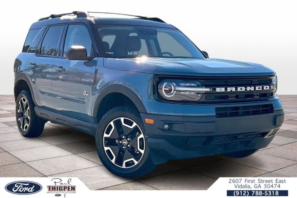Vidalia Ford Lincoln 2607 E 1st St Vidalia, Georgia 30474 912-788-5318 Equipment Group 300A, Ford Blue Advantage: Blue Certified Certified, 4D Sport Utility, 1.5L EcoBoost, 8-Speed Automatic, 4WD, 3.80 Axle Ratio, 4-Wheel Disc Brakes, 6 Speakers, ABS brakes, Air Conditioning, Alloy wheels, AM/FM radio: SiriusXM, AM/FM Stereo, Auto High-beam Headlights, Auto-dimming Rear-View mirror, Automatic temperature control, Brake assist, Compass, Delay-off headlights, Driver door bin, Driver vanity mirror, Dual front impact airbags, Dual front side impact airbags, Electronic Stability Control, Emergency communication system: SYNC 3 911 Assist, Exterior Parking Camera Rear, Four wheel independent suspension, Front anti-roll bar, Front Bucket Seats, Front Center Armrest, Front dual zone A/C, Front fog lights, Front reading lights, Fully automatic headlights, Heated door mirrors, Heated front seats, Heated steering wheel, Illuminated entry, Knee airbag, Leather Trimmed Heated Sport Contour Bucket Seats, Low tire pressure warning, Occupant sensing airbag, Outside temperature display, Overhead airbag, Overhead console, Panic alarm, Passenger door bin, Passenger vanity mirror, Power door mirrors, Power driver seat, Power passenger seat, Power steering, Power windows, Radio data system, Rain sensing wipers, Rear anti-roll bar, Rear Parking Sensors, Rear reading lights, Rear seat center armrest, Rear window defroster, Rear window wiper, Remote keyless entry, Roof rack: rails only, Security system, SiriusXM Radio, Speed control, Speed-sensing steering, Speed-Sensitive Wipers, Split folding rear seat, Steering wheel mounted audio controls, SYNC 3 Communications & Entertainment System, SYNC 3/Apple CarPlay/Android Auto, Tachometer, Telescoping steering wheel, Tilt steering wheel, Traction control, Trip computer, Variably intermittent wipers, and Wheels: 18" Ebony Black-Painted Aluminum. Area 51 2021 Ford Bronco Sport Outer Banks 4WD 4WD 1.5L EcoBoost **LOCAL TRADE**, 4G WiFi Hotspot Telematics, 8" Color Touchscreen, Android Auto, Apple Carplay, Auto LED Headlights, Backup Camera, Bluetooth w/ Streaming Audio, Parking Sensors, Power Mirror Package, Power Package, Push Button Start, Remote Start, Reverse Brake Assist, Reverse Sensing, 4D Sport Utility, 1.5L EcoBoost, 8-Speed Automatic, 4WD, 3.80 Axle Ratio, 4-Wheel Disc Brakes, 6 Speakers, ABS brakes, Air Conditioning, Alloy wheels, AM/FM radio: SiriusXM, AM/FM Stereo, Auto High-beam Headlights, Auto-dimming Rear-View mirror, Automatic temperature control, Brake assist, Compass, Delay-off headlights, Driver door bin, Driver vanity mirror, Dual front impact airbags, Dual front side impact airbags, Electronic Stability Control, Emergency communication system: SYNC 3 911 Assist, Equipment Group 300A, Exterior Parking Camera Rear, Four wheel independent suspension, Front anti-roll bar, Front Bucket Seats, Front Center Armrest, Front dual zone A/C, Front fog lights, Front reading lights, Fully automatic headlights, Heated door mirrors, Heated front seats, Heated steering wheel, Illuminated entry, Knee airbag, Leather Trimmed Heated Sport Contour Bucket Seats, Low tire pressure warning, Occupant sensing airbag, Outside temperature display, Overhead airbag, Overhead console, Panic alarm, Passenger door bin, Passenger vanity mirror, Power door mirrors, Power driver seat, Power passenger seat, Power steering, Power windows, Radio data system, Rain sensing wipers, Rear anti-roll bar, Rear Parking Sensors, Rear reading lights, Rear seat center armrest, Rear window defroster, Rear window wiper, Remote keyless entry, Roof rack: rails only, Security system, SiriusXM Radio, Speed control, Speed-sensing steering, Speed-Sensitive Wipers, Split folding rear seat, Steering wheel mounted audio controls, SYNC 3 Communications & Entertainment System, SYNC 3/Apple CarPlay/Android Auto, Tachometer, Telescoping steering wheel, Tilt steering wheel, Traction control, Trip computer, V