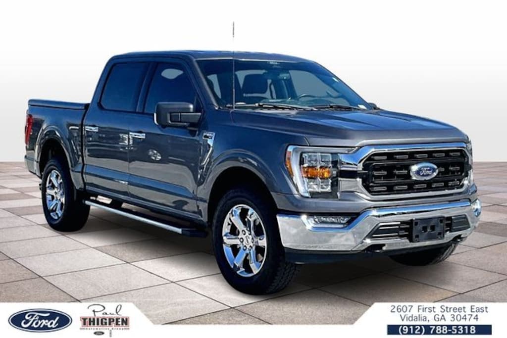 Vidalia Ford Lincoln 2607 E 1st St Vidalia, Georgia 30474 912-788-5318 Equipment Group 302A High (10-Way Power Driver & Passenger Seats, 8" Productivity Screen in Instrument Cluster, Auto-Dimming Rear-View Mirror, Class IV Trailer Hitch Receiver, Dual Zone Electronic Automatic Temperature Control, Heated Front Seats, Intelligent Access w/Push Button Start, Leather-Wrapped Steering Wheel, LED Reflector Headlamps, LED Sideview Mirror Spotlights, Onboard 400W Outlet, Power Glass Heated Sideview Mirrors, Radio: AM/FM SiriusXM w/360L, Rear Under-Seat Storage, Remote Start System w/Remote Tailgate Release, SecuriCode Drivers Side Keyless-Entry Keypad, SYNC 4 w/Enhanced Voice Recognition, and Zone Lighting), FX4 Off-Road Package (4x4 FX4 Off-Road Bodyside Decal, Hill Descent Control, Monotube Rear Shocks, Off-Road Tuned Front Shock Absorbers, Rock Crawl Mode, and Tray Style Floor Liner (47W)), Snow Plow Prep Package, Trailer Tow Package (Integrated Trailer Brake Controller and Pro Trailer Backup Assist), XLT Chrome Appearance Package (2-Bar Style Grille w/Chrome 2 Minor Bars, Bright Polished Step Bars, Chrome Door & Tailgate Handles w/Body-Color Bezel, Chrome Single-Tip Exhaust, and Wheels: 18" Chrome-Like PVD), Ford Blue Certified Certified, 4WD, 360 Degree Camera, 4-Wheel Disc Brakes, 6 Speakers, ABS brakes, Air Conditioning, Alloy wheels, AM/FM radio, Auto High-beam Headlights, Auto Start-Stop Removal, Brake assist, Bumpers: chrome, Cloth 40/20/40 Front Seat, Compass, Connected Built-In Navigation (DISC), Delay-off headlights, Driver door bin, Driver vanity mirror, Dual front impact airbags, Dual front side impact airbags, Electronic Stability Control, Emergency communication system: SYNC 4 911 Assist, Extended Range 36 Gallon Fuel Tank, Exterior Parking Camera Rear, Front anti-roll bar, Front Center Armrest w/Storage, Front fog lights, Front reading lights, Front wheel independent suspension, Fully automatic headlights, Heated door mirrors, Illuminated entry, Interior Work Surface, Low tire pressure warning, Occupant sensing airbag, Outside temperature display, Overhead airbag, Overhead console, Panic alarm, Passenger door bin, Passenger vanity mirror, Power door mirrors, Power steering, Power windows, Radio data system, Radio: AM/FM Stereo w/6 Speakers, Rear reading lights, Rear step bumper, Rear window defroster, Remote keyless entry, Remote Start System, Security system, Speed control, Speed-sensing steering, Split folding rear seat, Steering wheel mounted audio controls, SYNC 4, Tachometer, Telescoping steering wheel, Tilt steering wheel, Traction control, Trip computer, Variably intermittent wipers, Voltmeter, Wheels: 17" Silver Painted Aluminum, and Wheels: 20" Chrome-Like PVD. Carbonized Gray Metallic 2022 Ford F-150 XLT 4WD 5.0L V8 4WD, 10-Way Power Driver & Passenger Seats, 2-Bar Style Grille w/Chrome 2 Minor Bars, 360 Degree Camera, 4-Wheel Disc Brakes, 4x4 FX4 Off-Road Bodyside Decal, 6 Speakers, 8" Productivity Screen in Instrument Cluster, ABS brakes, Air Conditioning, Alloy wheels, AM/FM radio, Auto High-beam Headlights, Auto Start-Stop Removal, Auto-Dimming Rear-View Mirror, Brake assist, Bright Polished Step Bars, Bumpers: chrome, Chrome Door & Tailgate Handles w/Body-Color Bezel, Chrome Single-Tip Exhaust, Class IV Trailer Hitch Receiver, Cloth 40/20/40 Front Seat, Compass, Connected Built-In Navigation (DISC), Delay-off headlights, Driver door bin, Driver vanity mirror, Dual front impact airbags, Dual front side impact airbags, Dual Zone Electronic Automatic Temperature Control, Electronic Stability Control, Emergency communication system: SYNC 4 911 Assist, Equipment Group 302A High, Extended Range 36 Gallon Fuel Tank, Exterior Parking Camera Rear, Front anti-roll bar, Front Center Armrest w/Storage, Front fog lights, Front reading lights, Front wheel independent suspension, Fully automatic headlights, FX4 Off-Road Package, Heated door mirrors, Heated Front Seats, Hill Descent Control, Illumi