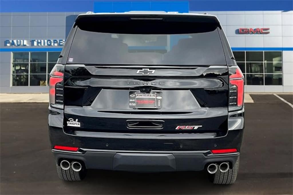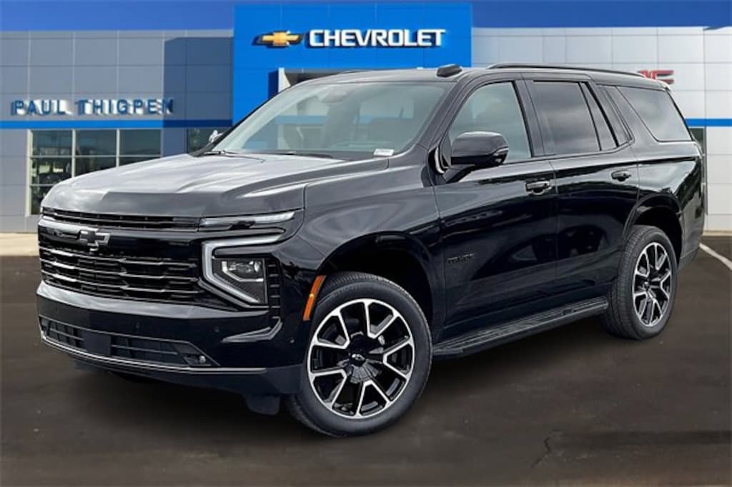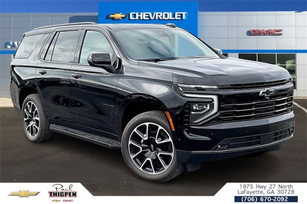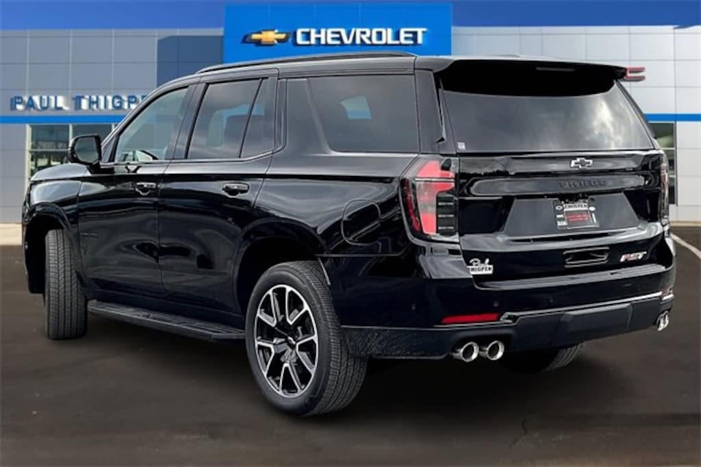 Black 2025 Chevrolet Tahoe RST EcoTec3 5.3L V8 4WD Advanced Technology Package (3 Years of OnStar Digital Services/Safety Services and Super Cruise), Advanced Trailering Package (Blind Zone Steering Assist w/Trailering, Hitch View w/Pan/Zoom Image Adjustment, and Smart Trailer Integration Indicator), All-Weather Liner Protection Package (LPO) (1st & 2nd Rows All-Weather Floor Liners (LPO), 3rd Row All-Weather Floor Liners (LPO), and All-Weather Cargo Mat (LPO)), Comfort Package (2nd Row Pwr Release 60/40 Split-Folding Bench Seat, 3rd Row 60/40 Power-Folding Split-Bench Seat, Bose 10-Speaker Centerpoint Surround Audio Sys Ft, Heated 2nd Row Outboard Seats, Heated Steering Wheel, LED Headlamps w/LED Daytime Running Lamps, LED Tail Lamps, Memory Settings, and Outside Heated Power-Adjustable Mirrors), Max Trailering Package (2-Speed Active Electronic AutoTrac Transfer Case, Hill Descent Control, and Integrated Trailer Brake Controller), Preferred Equipment Group 1SP (1st & 2nd Row Color-Keyed Carpeted Floor Mats, 3-Spoke Wrapped Steering Wheel, 3rd Row Manual 60/40 Split-Folding Bench Seats, Auto-Dimming Inside Rear-View Mirror, Bright Front & Rear Door Sill Plates, Color-Keyed Carpeting Floor Covering, Dual Exhaust System, Floor Console w/Storage Area, Front LED Fog Lamps, Front Pedestrian & Bicyclist Braking, Frontal Driver & Outboard Passenger Airbags, Memory Settings for Driver, Rear Power Liftgate, Remote Start, RST Exterior Features, SiriusXM w/360L Trial Subscription, Universal Home Remote, USB Ports, and Wireless Phone Charging), RST Capability Package (Air Ride Adaptive Suspension, Floor Console, and Magnetic Ride Control Suspension), Technology Package (15 Diagonal Multi-Color Head-Up Display and Inside Rearview Auto-Dimming Rear Camera Mirror), 4WD, Red Leather, 2-Way Power Driver Lumbar Seat Adjuster, 2-Way Power Front Passenger Lumbar Seat Adjuster, 3.23 Rear Axle Ratio, 3rd row seats: split-bench, 4-Wheel Disc Brakes, 6 Speakers, 6-Speaker Audio System Feature, 8-Way Power Driver Seat Adjuster, 8-Way Power Front Passenger Seat Adjuster, ABS brakes, Air Conditioning, Alloy wheels, AM/FM radio: SiriusXM with 360L, Apple CarPlay/Android Auto, Auto High-beam Headlights, Auto-dimming Rear-View mirror, Automatic temperature control, Brake assist, Bumpers: body-color, Compass, Delay-off headlights, Driver door bin, Driver vanity mirror, Dual front impact airbags, Dual front side impact airbags, Dual-Pane Power Panoramic Sunroof, Electronic Stability Control, Emergency communication system: OnStar and Chevrolet connected services capable, Exterior Parking Camera Rear, Extra Capacity Cooling System, Four wheel independent suspension, Front anti-roll bar, Front Bucket Seats, Front Center Armrest, Front dual zone A/C, Front fog lights, Front reading lights, Fully automatic headlights, Garage door transmitter, Heated door mirrors, Heated Driver & Front Passenger Seats, Heated front seats, Illuminated entry, Low tire pressure warning, Memory seat, Navigation system: Google built-in compatibility (select service plan required, terms and limitations apply), Occupant sensing airbag, Outside temperature display, Overhead airbag, Overhead console, Panic alarm, Passenger door bin, Passenger vanity mirror, Perforated Leather Seat Trim, Power door mirrors, Power driver seat, Power Liftgate, Power passenger seat, Power Release 2nd Row Bucket Seats, Power steering, Power windows, Premium audio system: Chevrolet Infotainment 3 Premium, Premium Smooth Ride Suspension, Radio data system, Radio: 17.7 Diagonal Advanced Color LCD Display, Rain sensing wipers, Rear air conditioning, Rear anti-roll bar, Rear reading lights, Rear seat center armrest, Rear Seat Media System, Rear window defroster, Rear window wiper, Remote keyless entry, Security system, Set of 4 Wheel Locks (LPO), Speed control, Speed-sensing steering, Split folding rear seat, Spoiler, Steering wheel mounted audio controls, Tachomet