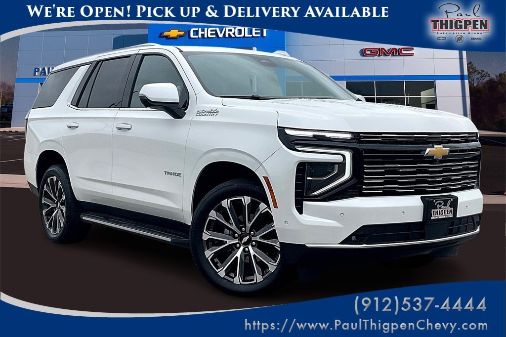 Paul Thigpen Chevrolet GMC 100 Semco Drive Vidalia, Georgia 30474 (844) 283-5935 www.paulthigpenchevy.com Paul Thigpen Chevrolet GMC has New car Preped this 2025 Chevrolet Tahoe and comes with the following License Plate Front Mounting Package, Preferred Equipment Group 3LZ (15 Diagonal Multi-Color Head-Up Display, 1st & 2nd Row Color-Keyed Carpeted Floor Mats, 3-Spoke Wrapped Steering Wheel, 3rd Row 60/40 Power-Folding Split-Bench Seat, Bose 10-Speaker Centerpoint Surround Audio Sys Ft, Bright Front & Rear Door Sill Plates, Chrome Door Handles w/Body-Color Strip, Color-Keyed Carpeting Floor Covering, Dual Exhaust System, Floor Console, Front LED Fog Lamps, Front Pedestrian & Bicyclist Braking, Frontal Driver & Outboard Passenger Airbags, Heated 2nd Row Outboard Seats, Heated Steering Wheel, Inside Rearview Auto-Dimming Rear Camera Mirror, LED Headlamps w/LED Daytime Running Lamps, LED Tail Lamps, Memory Settings, Outside Heated Power-Adjustable Mirrors, Power Release 2nd Row Bucket Seats, Power Tilt & Telescopic Steering Column, Rear Power Liftgate, Remote Start, SiriusXM w/360L Trial Subscription, Universal Home Remote, and Wireless Phone Charging), Tahoe High Country, 4D Sport Utility, EcoTec3 6.2L V8, 10-Speed Automatic with Overdrive, 4WD, 10 Speakers, 3.23 Rear Axle Ratio, 3rd row seats: split-bench, 4-Way Power Driver Lumbar Seat Adjuster, 4-Way Power Front Passenger Lumbar Seat Adjuster, 4-Wheel Disc Brakes, 8-Way Power Driver Seat Adjuster, 8-Way Power Front Passenger Seat Adjuster, ABS brakes, Adaptive suspension, Air Conditioning, Alloy wheels, AM/FM radio: SiriusXM with 360L, Apple CarPlay/Android Auto, Auto High-beam Headlights, Auto-dimming door mirrors, Auto-dimming Rear-View mirror, Auto-leveling suspension, Automatic temperature control, Brake assist, Bumpers: body-color, Compass, Delay-off headlights, Driver & Front Passenger Heated & Ventilated Seats, Driver door bin, Driver vanity mirror, Dual front impact airbags, Dual front side impact airbags, Electronic Stability Control, Emergency communication system: OnStar and Chevrolet connected services capable, Exterior Parking Camera Rear, Four wheel independent suspension, Front anti-roll bar, Front Bucket Seats, Front Center Armrest, Front dual zone A/C, Front fog lights, Front reading lights, Fully automatic headlights, Garage door transmitter, Heads-Up Display, Heated door mirrors, Heated Driver & Front Passenger Seats, Heated front seats, Heated rear seats, Heated steering wheel, Illuminated entry, Low tire pressure warning, Magnetic Ride Control Suspension, Memory seat, Navigation system: Google built-in compatibility (select service plan required, terms and limitations apply), Occupant sensing airbag, Outside temperature display, Overhead airbag, Overhead console, Panic alarm, Passenger door bin, Passenger vanity mirror, Perforated Leather Seat Trim, Power door mirrors, Power driver seat, Power Liftgate, Power passenger seat, Power steering, Power windows, Premium audio system: Chevrolet Infotainment 3 Premium, Radio data system, Radio: 17.7 Diagonal Advanced Color LCD Display, Rain sensing wipers, Rear air conditioning, Rear anti-roll bar, Rear reading lights, Rear window defroster, Rear window wiper, Remote keyless entry, Security system, Set of 4 Wheel Locks (LPO), Speed control, Speed-sensing steering, Split folding rear seat, Spoiler, Steering wheel memory, Steering wheel mounted audio controls, Tachometer, Telescoping steering wheel, Tilt steering wheel, Traction control, Trip computer, Turn signal indicator mirrors, Variably intermittent wipers, Ventilated front seats, Voltmeter, and Wheels: 22 x 9 Bright Machined AluminuM.
