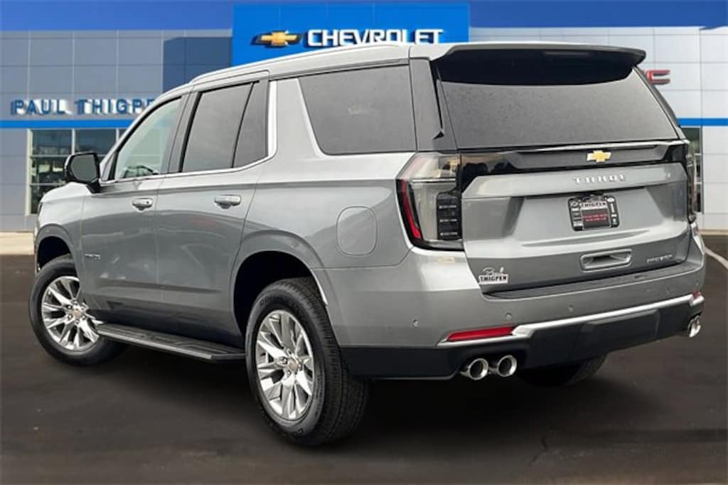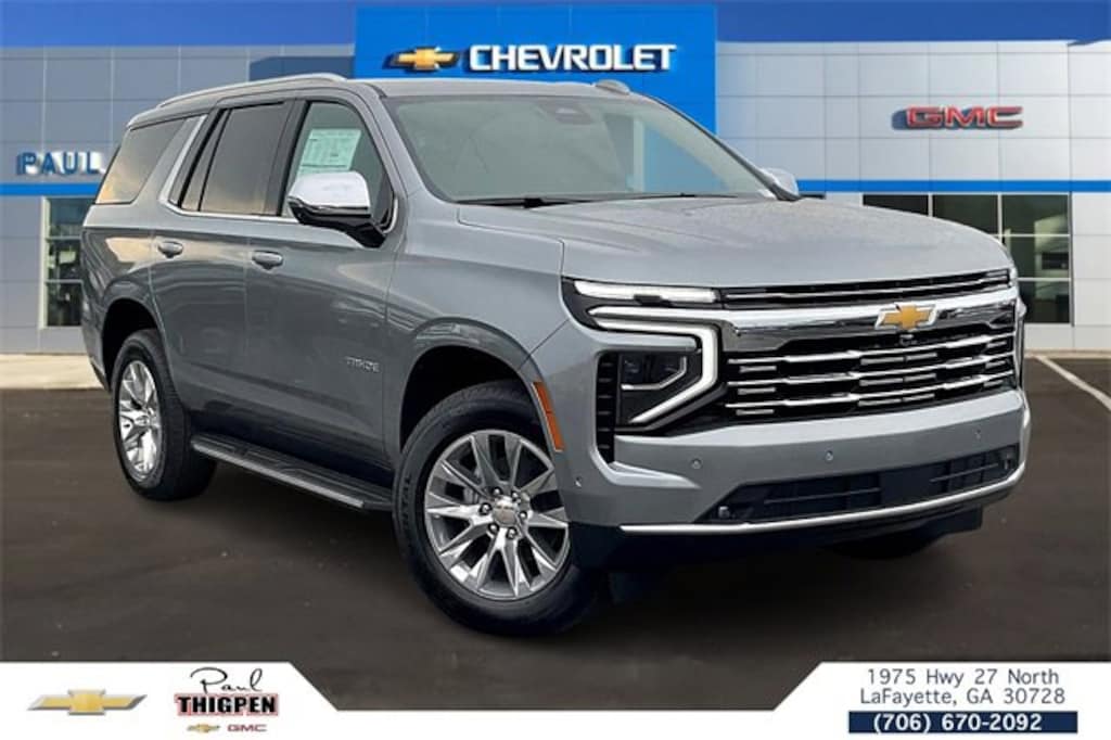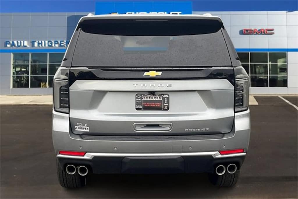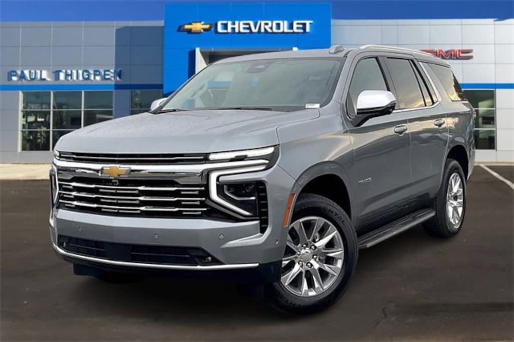 Sterling Gray Metallic 2025 Chevrolet Tahoe Premier EcoTec3 5.3L V8 RWD License Plate Front Mounting Package, Preferred Equipment Group 1LZ (1st & 2nd Row Color-Keyed Carpeted Floor Mats, 3-Spoke Wrapped Steering Wheel, 3rd Row 60/40 Power-Folding Split-Bench Seat, Auto-Dimming Inside Rear-View Mirror, Bose 10-Speaker Centerpoint Surround Audio Sys Ft, Bright Front & Rear Door Sill Plates, Chrome Door Handles w/Body-Color Strip, Color-Keyed Carpeting Floor Covering, Dual Exhaust System, Floor Console, Front LED Fog Lamps, Front Pedestrian & Bicyclist Braking, Frontal Driver & Outboard Passenger Airbags, Heated 2nd Row Outboard Seats, Heated Steering Wheel, LED Headlamps w/LED Daytime Running Lamps, LED Tail Lamps, Memory Settings, Outside Heated Power-Adjustable Mirrors, Power Release 2nd Row Bucket Seats, Power Tilt & Telescopic Steering Column, Rear Power Liftgate, Remote Start, SiriusXM w/360L Trial Subscription, Universal Home Remote, and Wireless Phone Charging), Jet Black Leather, 10 Speakers, 20 x 9 Polished Aluminum Wheels, 3.23 Rear Axle Ratio, 3rd row seats: split-bench, 4-Way Power Driver Lumbar Seat Adjuster, 4-Way Power Front Passenger Lumbar Seat Adjuster, 4-Wheel Disc Brakes, 8-Way Power Driver Seat Adjuster, 8-Way Power Front Passenger Seat Adjuster, ABS brakes, Adaptive suspension, Air Conditioning, Alloy wheels, AM/FM radio: SiriusXM with 360L, Apple CarPlay/Android Auto, Auto High-beam Headlights, Auto-dimming door mirrors, Auto-dimming Rear-View mirror, Auto-leveling suspension, Automatic temperature control, Brake assist, Bumpers: body-color, Compass, Delay-off headlights, Driver & Front Passenger Heated & Ventilated Seats, Driver door bin, Driver vanity mirror, Dual front impact airbags, Dual front side impact airbags, Electronic Stability Control, Emergency communication system: OnStar and Chevrolet connected services capable, Exterior Parking Camera Rear, Four wheel independent suspension, Front anti-roll bar, Front Bucket Seats, Front Center Armrest, Front dual zone A/C, Front fog lights, Front reading lights, Fully automatic headlights, Garage door transmitter, Heated door mirrors, Heated Driver & Front Passenger Seats, Heated front seats, Heated rear seats, Heated steering wheel, Illuminated entry, Low tire pressure warning, Magnetic Ride Control Suspension, Memory seat, Navigation system: Google built-in compatibility (select service plan required, terms and limitations apply), Occupant sensing airbag, Outside temperature display, Overhead airbag, Overhead console, Panic alarm, Passenger door bin, Passenger vanity mirror, Perforated Leather Seat Trim, Power door mirrors, Power driver seat, Power Liftgate, Power passenger seat, Power steering, Power windows, Premium audio system: Chevrolet Infotainment 3 Premium, Radio data system, Radio: 17.7 Diagonal Advanced Color LCD Display, Rain sensing wipers, Rear air conditioning, Rear anti-roll bar, Rear reading lights, Rear window defroster, Rear window wiper, Remote keyless entry, Security system, Speed control, Speed-sensing steering, Split folding rear seat, Spoiler, Steering wheel memory, Steering wheel mounted audio controls, Tachometer, Telescoping steering wheel, Tilt steering wheel, Traction control, Trip computer, Turn signal indicator mirrors, Variably intermittent wipers, Ventilated front seats, and Voltmeter. Jet Black Leather. Price includes: $1000 - Customer Cash. Exp. 11/03/2025