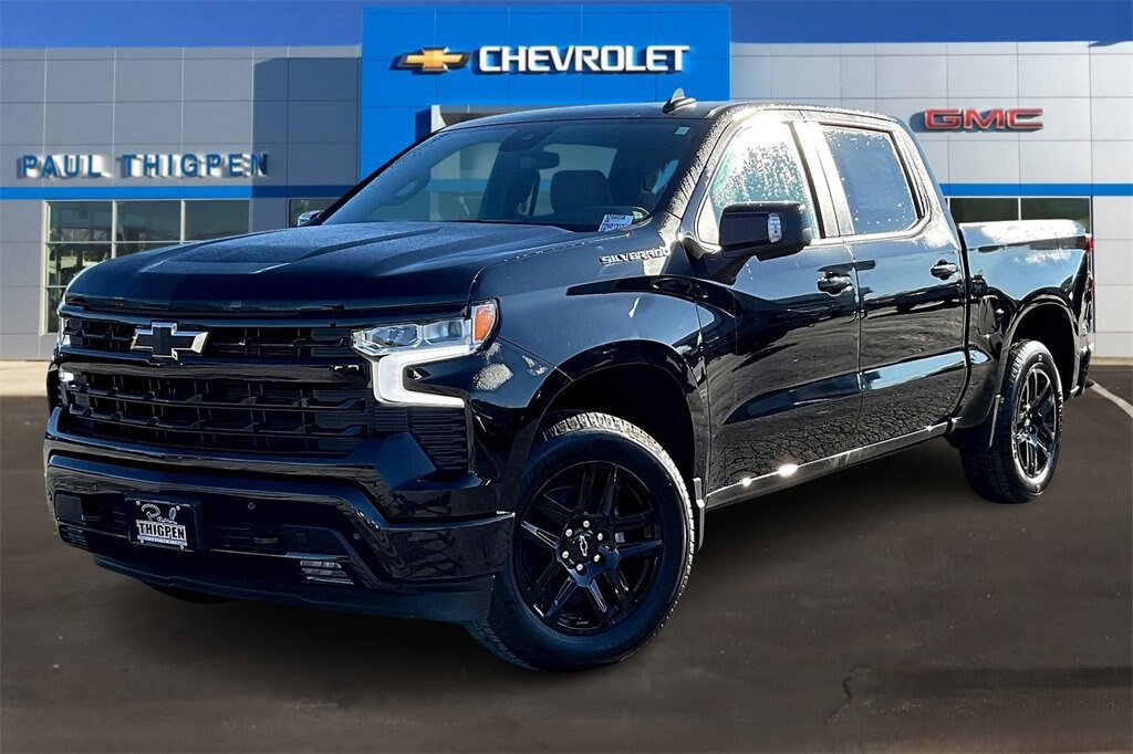 Black 2026 Chevrolet Silverado 1500 RST EcoTec3 5.3L V8 4WD Convenience Package (10-Way Power Driver Seat w/Lumbar, 120-Volt Bed Mounted Power Outlet, 120-Volt Interior Power Outlet, Dual Rear USB Ports (Charge Only), Dual-Zone Automatic Climate Control, Electric Rear-Window Defogger, Heated Driver & Front Outboard Passenger Seats, Heated Steering Wheel, Keyless Open & Start, LED Cargo Area Lighting, Manual Tilt/Telescoping Steering Column, Remote Vehicle Starter System, Theft Deterrent System (Unauthorized Entry), and Wrapped Steering Wheel), Convenience Package II (Hitch Guidance w/Hitch View, In-Vehicle Trailering System App, Power Sliding Rear Window w/Rear Defogger, Premium Bose 7-Speaker Sound System, and Universal Home Remote), High Capacity Suspension Package, Leather Package (Leather-Appointed Front Seat Trim), Preferred Equipment Group 1SP (12.3 Multicolor Reconfigurable Digital Display, 6-Speaker Audio System, All-Star Edition, Auto-Locking Rear Differential, Bluetooth® For Phone, Color-Keyed Carpeting Floor Covering, Deep-Tinted Glass, Electronic Cruise Control, EZ Lift Power Lock & Release Tailgate, Front Frame-Mounted Black Recovery Hooks, Front LED Fog Lamps, Front Rubberized Vinyl Floor Mats, HD Rear Vision Camera, Heated Power-Adjustable Outside Mirrors, High Gloss Black Mirror Caps, Inside Rear-View Mirror w/Tilt, Integrated Trailer Brake Controller, OnStar Services Capable, Power Front Windows w/Driver Express Up/Down, Power Front Windows w/Passenger Express Down, Power Rear Windows w/Express Down, Rear 60/40 Folding Bench Seat (Folds Up), Rear Rubberized-Vinyl Floor Mats, SiriusXM w/360L Trial Subscription, Standard Tailgate, Steering Wheel Audio Controls, Teen Driver, Tire Pressure Monitoring System, and Wi-Fi Hot Spot Capable), Protection Package (Chevytec Spray-On Black Bedliner and Rear Wheelhouse Liners), Safety Package (HD Surround Vision, Perimeter Lighting, Rear Cross Traffic Braking, Rear Pedestrian Alert, Trailer Camera Provisions, Trailer Side Blind Zone Alert, and Ultrasonic Front & Rear Park Assist), Standard Suspension Package, Trailering Package (Hitch Guidance), Up-Level Rear Seat w/Storage Package, 10-Speed Automatic, 4WD, Gideon/Very Dark Atmosphere Leather, 170 Amp Alternator, 2 USB Data Ports, 220 Amp Alternator, 3.23 Rear Axle Ratio, 4-Wheel Disc Brakes, 40/20/40 Front Split-Bench Seat, 6 Speakers, ABS brakes, Air Conditioning, All-Weather Floor Liner (LPO), Alloy wheels, AM/FM radio: SiriusXM with 360L, Apple CarPlay/Android Auto, Auto High-beam Headlights, Automatic Emergency Braking, Automatic temperature control, Auxiliary External Transmission Oil Cooler, Bed View Camera, Brake assist, Bumpers: body-color, Cloth Seat Trim, Compass, Delay-off headlights, Driver door bin, Driver vanity mirror, Dual front impact airbags, Dual front side impact airbags, Electronic Stability Control, Electronic Transmission Range Selector Shifter, Emergency communication system: OnStar, Engine Block Heater, External Engine Oil Cooler, Floor Mounted Center Console, Following Distance Indicator, Forward Collision Alert, Front anti-roll bar, Front Bucket Seats, Front Center Armrest w/Storage, Front dual zone A/C, Front fog lights, Front License Plate Kit, Front Pedestrian Braking, Front reading lights, Front wheel independent suspension, Fully automatic headlights, Heated door mirrors, Heated front seats, Heated steering wheel, Illuminated entry, IntelliBeam Automatic High Beam On/Off, Lane Keep Assist w/Lane Departure Warning, Low tire pressure warning, Occupant sensing airbag, Outside temperature display, Overhead airbag, Overhead console, Panic alarm, Passenger door bin, Passenger vanity mirror, Power door mirrors, Power driver seat, Power steering, Power Sunroof, Power windows, Premium audio system: Chevrolet Infotainment 3 Premium, Radio data system, Radio: Chevrolet Infotainment 3 Premium Price includes: $1000 - Bonus Cash. Exp