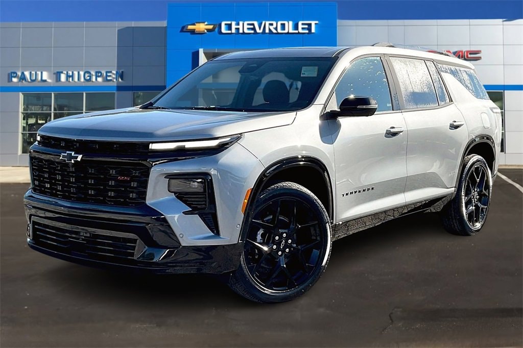 Sterling Gray Metallic 2026 Chevrolet Traverse RS 2.5L DOHC FWD 12 Speakers, 3rd row seats: split-bench, 4-Wheel Disc Brakes, 6-Way Power Front Passenger Seat Adjuster, 8-Way Power Driver Seat Adjuster, ABS brakes, Air Conditioning, Alloy wheels, AM/FM radio: SiriusXM with 360L, Apple CarPlay/Android Auto, Auto High-beam Headlights, Auto tilt-away steering wheel, Auto-dimming door mirrors, Automatic temperature control, Bose Premium 12-Speaker Audio System Feature, Brake assist, Bumpers: body-color, Child-Seat-Sensing Airbag, Compass, Delay-off headlights, Driver 4-Way Power Lumbar Seat Adjuster, Driver door bin, Driver vanity mirror, Dual front impact airbags, Dual front side impact airbags, Electronic Stability Control, Emergency communication system: OnStar, Exterior Parking Camera Rear, Four wheel independent suspension, Front anti-roll bar, Front Bucket Seats, Front Center Armrest, Front dual zone A/C, Front Passenger 4-Way Power Lumbar Seat Adjuster, Front reading lights, Fully automatic headlights, Garage door transmitter, Heated door mirrors, Heated Driver & Front Passenger Seats, Heated front seats, Heated rear seats, Heated steering wheel, Illuminated entry, Low tire pressure warning, Memory seat, Navigation System, Occupant sensing airbag, Outside temperature display, Overhead airbag, Overhead console, Panic alarm, Passenger door bin, Passenger vanity mirror, Perforated Leather-Appointed Seat Trim, Power door mirrors, Power driver seat, Power Liftgate, Power passenger seat, Power steering, Power windows, Radio data system, Radio: Audio System w/17.7 Diagonal Display, Rain sensing wipers, Rear air conditioning, Rear anti-roll bar, Rear reading lights, Rear window defroster, Rear window wiper, Remote keyless entry, Security system, SiriusXM w/360L Trial Subscription, Speed control, Speed-sensing steering, Spoiler, Sport steering wheel, Steering wheel memory, Steering wheel mounted audio controls, Tachometer, Telescoping steering wheel, Tilt steering wheel, Traction control, Trip computer, Turn signal indicator mirrors, Variably intermittent wipers, Ventilated Driver & Front Passenger Seats, Ventilated front seats, Voltmeter, and Wheels: 22 High Gloss Black Painted Aluminum.