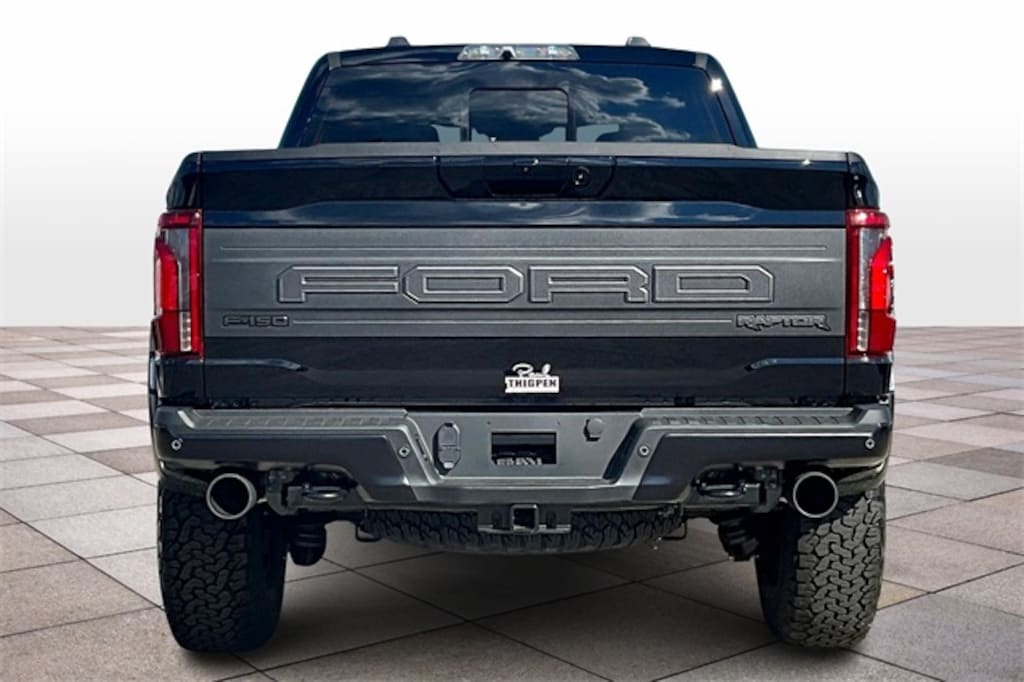 Agate Black Metallic 2025 Ford F-150 Raptor 37 4WD 10-Speed Automatic 3.5L V6 EcoBoost Equipment Group 802A Raptor 37 (Alcantara Suede & Leather RECARO Front Seats, Carbon Fiber Interior Appliques, Dual Valve Shocks, Electronic Locking w/4.10 Axle Ratio, Modular Front Bumper, and Wheels: Raptor 37 Unique 17" Cast Aluminum), 4D SuperCrew, 3.5L V6 EcoBoost, 10-Speed Automatic, 4WD, 14 Speakers, AM/FM radio: SiriusXM with 360L, Automatic temperature control, Front dual zone A/C, Navigation System, Navigation system: Connected Navigation, Radio data system, Radio: B&O Unleashed Sound System by Bang & Olufsen, SYNC 4 w/Enhanced Voice Recognition, 17" Cast Aluminum Wheels, 4-Wheel Disc Brakes, ABS brakes, Adjustable pedals, Air Conditioning, Alloy wheels, Auto High-beam Headlights, Auto tilt-away steering wheel, Auto-dimming door mirrors, Auto-dimming Rear-View mirror, Brake assist, Bumpers: body-color, Compass, Delay-off headlights, Driver door bin, Driver vanity mirror, Dual front impact airbags, Dual front side impact airbags, Electronic Stability Control, Emergency communication system: SYNC 4 911 Assist, Front anti-roll bar, Front Bucket Seats, Front Center Armrest, Front fog lights, Front reading lights, Front wheel independent suspension, Fully automatic headlights, Garage door transmitter, Heads-Up Display, Heated door mirrors, Heated front seats