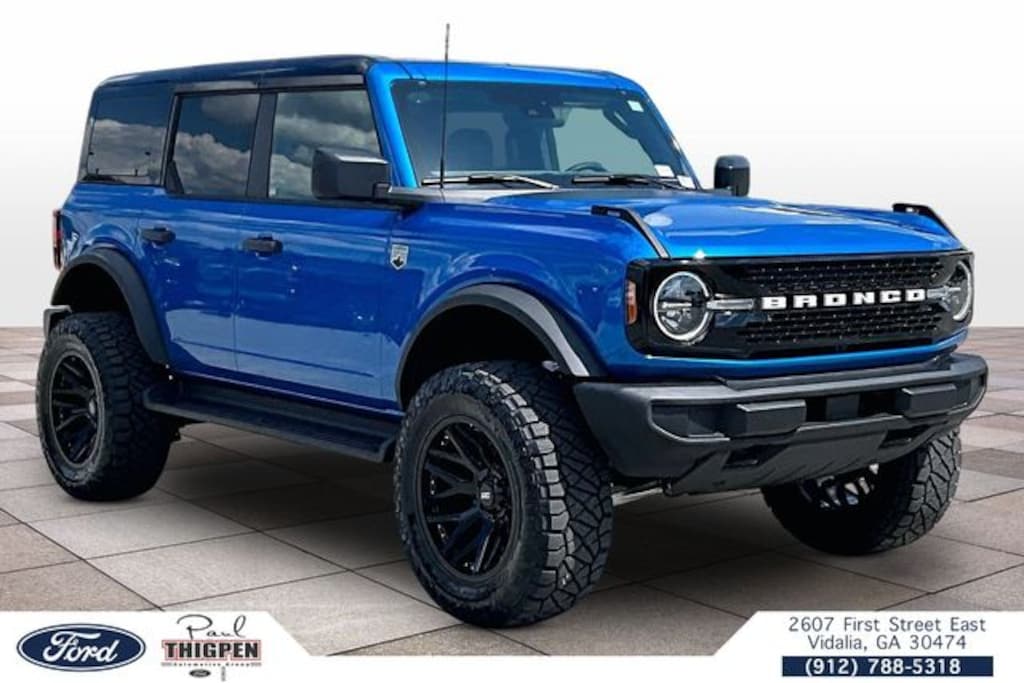 Velocity Blue Metallic 2026 Ford Bronco Big Bend 4WD 10-Speed Automatic 2.3L EcoBoost I-4 Vidalia Ford Lincoln 2607 E 1st St Vidalia, Georgia 30474 912-788-5318 Black Appearance Package (Black Molded-in-Color Door Handles, Black Molded-in-Color Fender Flares, Black Molded-in-Color Sideview Mirror Caps, and Black-Painted Molded-in-Color Grille), Ford Connectivity Package (1-Year Included), 4-Wheel Disc Brakes, 4.46 Axle Ratio, 7 Speakers, ABS brakes, Air Conditioning, Alloy wheels, AM/FM radio: SiriusXM with 360L, AM/FM Stereo, Auto High-beam Headlights, Brake assist, Cloth Bucket Seats, Compass, Delay-off headlights, Driver door bin, Driver vanity mirror, Dual front impact airbags, Dual front side impact airbags, Electronic Stability Control, Emergency communication system: 911 Assist, Exterior Parking Camera Rear, Front and Rear Floor Liners Without Carpet Floor Mats, Front anti-roll bar, Front Bucket Seats, Front Center Armrest, Front License Plate Bracket, Front reading lights, Front Row Top Panels and Door Storage Bags, Front wheel independent suspension, Fully automatic headlights, Hard Top Sound Deadening Headliner, Heated door mirrors, Illuminated entry, Integrated roll-over protection, Low tire pressure warning, Occupant sensing airbag, Outside temperature display, Overhead airbag, Overhead console, Panic alarm, Passenger door bin, Passenger vanity mirror, Power door mirrors, Power steering, Power windows, Radio data system, Rear-Window Defroster and Washer, Remote keyless entry, Security system, Shadow Black Painted Hard Top, Side Step, SiriusXM with 360L, Speed control, Split folding rear seat, Steering wheel mounted audio controls, SYNC 4, Tachometer, Telescoping steering wheel, Tilt steering wheel, Traction control, Trip computer, Variably intermittent wipers, and Wheels: 17" Carbonized Gray-Painted Aluminum. Price includes: $750 - Retail Customer Cash. Exp. 04/30/2026