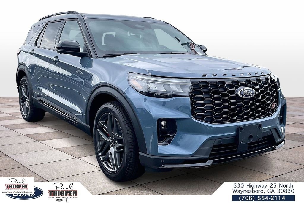 Vapor Blue Metallic 2026 Ford Explorer ST RWD 10-Speed Automatic 3.0L EcoBoost V6 10 Speakers, 3rd row seats: bench, 4-Wheel Disc Brakes, ABS brakes, Air Conditioning, Alloy wheels, AM/FM radio: SiriusXM with 360L, Apple CarPlay/Android Auto, Auto High-beam Headlights, Auto-dimming door mirrors, Auto-dimming Rear-View mirror, Automatic temperature control, BlueCruise Equipped (1-Year + 90-Day Plan), Brake assist, Bumpers: body-color, Compass, Delay-off headlights, Driver door bin, Driver vanity mirror, Dual front impact airbags, Dual front side impact airbags, Electronic Stability Control, Emergency communication system: 911 Assist, Exterior Parking Camera Rear, Ford Connectivity Package (one-Time Purchase - 7 Years), Four wheel independent suspension, Front and 2nd Rows Floor Liners with Carper Floor Mats, Front anti-roll bar, Front Bucket Seats, Front Center Armrest, Front dual zone A/C, Front fog lights, Front License Plate Bracket, Front reading lights, Fully automatic headlights, Garage door transmitter, Heated door mirrors, Heated front seats, Heated rear seats, Heated steering wheel, Heated/Ventilated Miko Suede Captain's Chairs, Illuminated entry, Knee airbag, Leather steering wheel, Low tire pressure warning, Memory seat, Multicontour Seats with Front Active Motion, Navigation System, Occupant sensing airbag, Outside temperature display, Overhead airbag, Overhead console, Panic alarm, Panoramic Fixed Glass Roof with Power Shade, Passenger door bin, Passenger vanity mirror, Power door mirrors, Power driver seat, Power Liftgate, Power passenger seat, Power steering, Power windows, Radio: B&O Sound System by Bang & Olufsen, Radio: B&O Sound System by Bang and Olufsen, Rain sensing wipers, Rear air conditioning, Rear anti-roll bar, Rear reading lights, Rear window defroster, Rear window wiper, Remote Control Front Windows, Remote keyless entry, SecuriCode Keyless Entry Keypad, Security system, Speed control, Speed-sensing steering, Speed-Sensitive Wipers, Split folding rear seat, Spoiler, Sport steering wheel, Steering wheel mounted audio controls, Sun and Sound Package, Tachometer, Telescoping steering wheel, Tilt steering wheel, Traction control, Trip computer, Turn signal indicator mirrors, Variably intermittent wipers, Ventilated front seats, Wheels: 21" Magnetite-Painted Aluminum.