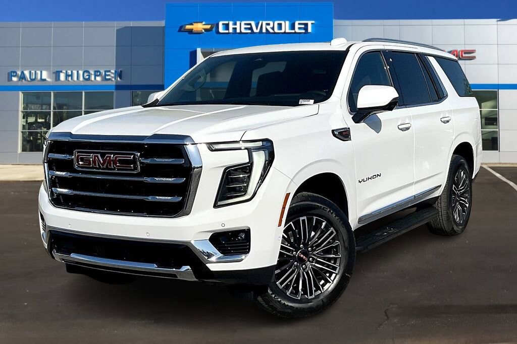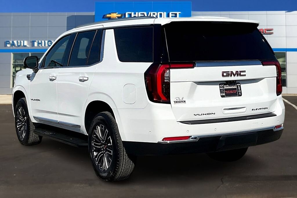 Summit White 2026 GMC Yukon Elevation EcoTec3 5.3L V8 4WD Elevation Premium Package (Dual-Pane Panoramic Power Sunroof and Rear Seat Media System), Floor Liner Package (1st and 2nd Rows All-Weather Floor Liners, 3rd Row All-Weather Floor Liners, and All-Weather Cargo Mat), License Plate Front Mounting Package, Max Trailering Package (Blind Zone Steering Assist with Trailering, Extra Capacity Cooling System, Hill Descent Control, Hitch View, Integrated Trailer Brake Controller, and Smart Trailer Integration Indicator), Preferred Equipment Group 4SA, Technology Package (15 Diagonal Multi-Color Head-Up Display, 4-Way Power Driver Lumbar Seat Adjuster, 4-Way Power Front Passenger Lumbar Seat Adjuster, Inside Rearview Auo-Dimming Rear Camera Mirror, and Perforated Heated and Ventilated Driver and Front Passenger Seats), 4WD, 10 Speakers, 3.23 Rear Axle Ratio, 3rd row seats: split-bench, 4-Wheel Disc Brakes, ABS brakes, Air Conditioning, Alloy wheels, AM/FM radio: SiriusXM with 360L, Apple CarPlay/Android Auto, Audio memory, Auto High-beam Headlights, Auto-dimming door mirrors, Auto-dimming Rear-View mirror, Automatic temperature control, Bodyside moldings, Bose 10-Speaker Surround with CenterPoint, Brake assist, Bumpers: body-color, Compass, CoreTech/Perforated Leather-Appointed Seating, Delay-off headlights, Driver Attention Assist, Driver door bin, Driver vanity mirror, Dual front impact airbags, Dual front side impact airbags, Electronic Stability Control, Emergency communication system: OnStar and GMC connected services capable, Exterior Parking Camera Rear, Floor Console, Four wheel independent suspension, Front anti-roll bar, Front Bucket Seats, Front Center Armrest, Front dual zone A/C, Front fog lights, Front reading lights, Fully automatic headlights, Garage door transmitter, Heated door mirrors, Heated Driver and Front Passenger Seats, Heated front seats, Heated rear seats, Heated steering wheel, Illuminated entry, Low tire pressure warning, Memory seat, Navigation system: GMC Connected Navigation, Occupant sensing airbag, Outside temperature display, Overhead airbag, Overhead console, Panic alarm, Passenger door bin, Passenger vanity mirror, Power door mirrors, Power driver seat, Power Liftgate, Power passenger seat, Power Release 2nd Row Bucket Seats, Power steering, Power windows, Premium Smooth Ride Suspension, Radio: 16.8 Diagonal Premium GMC Infotainment System, Rain sensing wipers, Rear air conditioning, Rear anti-roll bar, Rear reading lights, Rear seat center armrest, Rear window defroster, Rear window wiper, Remote keyless entry, Security system, SiriusXM with 360L, Speed control, Speed-sensing steering, Split folding rear seat, Spoiler, Steering wheel mounted audio controls, Super Cruise, Tachometer, Telescoping steering wheel, Tilt steering wheel, Traction control, Trip computer, Turn signal indicator mirrors, Variably intermittent wipers, Voltmeter, and Wheels: 20 x 9 Machined and Painted. 4WD.