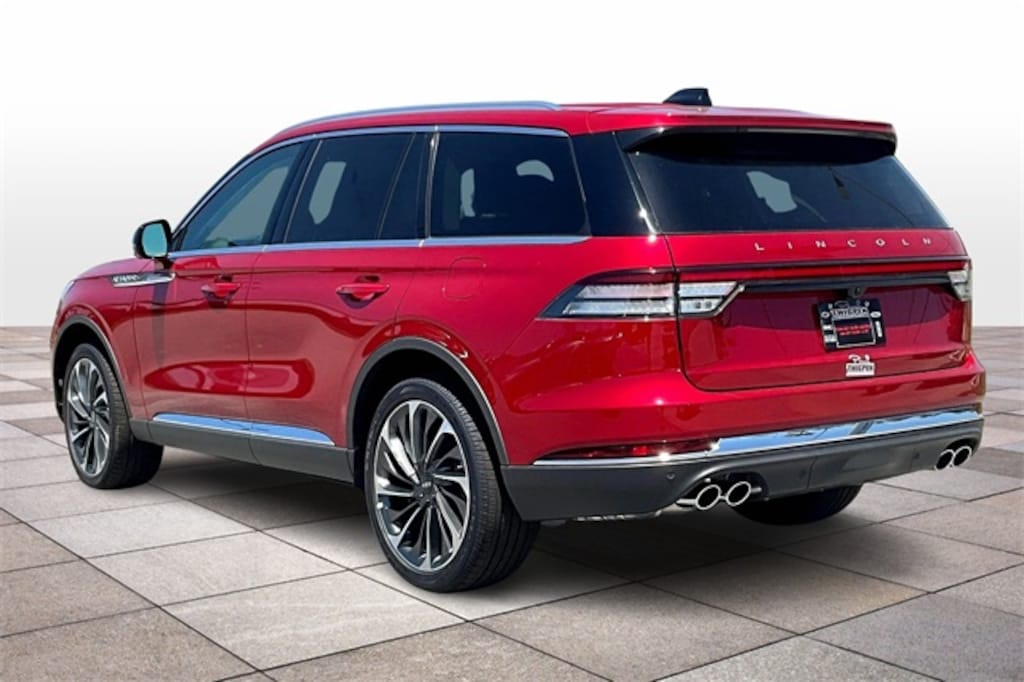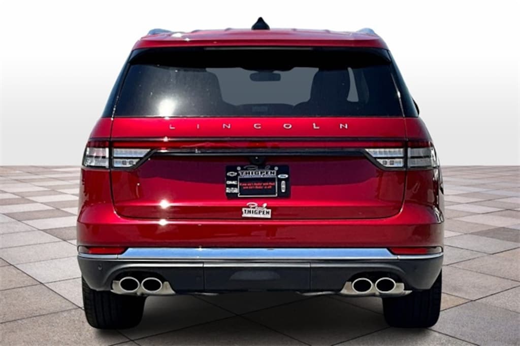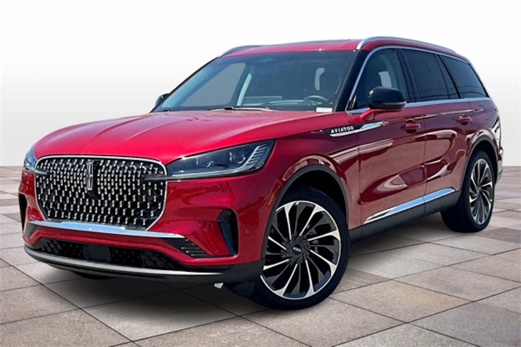 Red Carpet Tinted Clearcoat 2025 Lincoln Aviator Reserve AWD 10-Speed Automatic 3.0L V6 Equipment Group 201A (Advanced Heads-Up Display, Auto Air Refresh, Lincoln BlueCruise Equipped (4-Years Included), Wheels: 22" Bright-Machined Aluminum, and Wireless Charging Pad), Illumination Package (Adaptive Dynamic Bending Lighting, Adaptive Pixel LED Headlamps, Illuminated Lincoln Star in Grille, Lincoln Dynamic Signature Lighting, and Speed Dependent Lighting), Luxury Package (30-Way Perfect Position Seats w/Active Motion and Radio: Revel Ultima 3D Audio System w/28 Speakers), Aviator Reserve, 4D Sport Utility, 3.0L V6, 10-Speed Automatic, AWD, Red Carpet Tinted Clearcoat, Onyx Leather, Navigation system: Connected Navigation (1-year trial), 14 Speakers, 3rd row seats: split-bench, 4-Wheel Disc Brakes, 40/Mini Console/40 Dual Captain's Chairs, ABS brakes, Adaptive suspension, Air Conditioning, Alloy wheels, AM/FM radio: SiriusXM, Apple CarPlay/Android Auto, Audio memory, Auto High-beam Headlights, Auto-dimming door mirrors, Auto-dimming Rear-View mirror, Automatic temperature control, Brake assist, Bumpers: body-color, Compass, Delay-off headlights, Driver door bin, Driver vanity mirror, Dual front impact airbags, Dual front side impact airbags, Electronic Stability Control, Emergency communication system