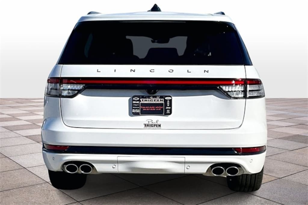 Pristine White Metallic Tri-Coat 2026 Lincoln Aviator Reserve AWD 10-Speed Automatic 3.0L V6 Vidalia Ford Lincoln 2607 E 1st St Vidalia, Georgia 30474 912-788-5318 Lincoln Connectivity Package (4-Years), 14 Speakers, 3rd row seats: split-bench, 4-Wheel Disc Brakes, 40/Mini Console/40 Dual Captain's Chairs, ABS brakes, Adaptive suspension, Air Conditioning, Alloy wheels, AM/FM radio: SiriusXM, Apple CarPlay/Android Auto, Audio memory, Auto Heated and Ventilated Driver and Passenger Seats, Auto High-beam Headlights, Auto-dimming door mirrors, Auto-dimming Rear-View mirror, Automatic temperature control, Brake assist, Bumpers: body-color, Compass, Delay-off headlights, Driver door bin, Driver vanity mirror, Dual front impact airbags, Dual front side impact airbags, Electronic Stability Control, Emergency communication system: 911 Assist, Four wheel independent suspension, Front anti-roll bar, Front Bucket Seats, Front Center Armrest, Front dual zone A/C, Front reading lights, Fully automatic headlights, Garage door transmitter, Genuine wood console insert, Genuine wood dashboard insert, Heads-Up Display, Heated door mirrors, Heated front seats, Heated steering wheel, HVAC memory, Illuminated entry, Knee airbag, Leather steering wheel, Lincoln App, Lincoln BlueCruise Equipped (4-Years Included), Lincoln Digital Experience, Low tire pressure warning, Memory seat, Navigation system: Google Maps, Occupant sensing airbag, Outside temperature display, Overhead airbag, Overhead console, Panic alarm, Passenger door bin, Passenger vanity mirror, Power door mirrors, Power driver seat, Power Liftgate, Power moonroof: Panoramic Vista Roof, Power passenger seat, Power steering, Power windows, Premium Leather Front Captain's Chairs, Radio data system, Radio: Revel Audio System with 14 Speakers, Rain sensing wipers, Rear air conditioning, Rear anti-roll bar, Rear audio controls, Rear dual zone A/C, Rear reading lights, Rear window defroster, Rear window wiper, Remote keyless entry, Security system, SiriusXM, Speed control, Speed-Sensitive Wipers, Split folding rear seat, Spoiler, Steering wheel memory, Steering wheel mounted A/C controls, Steering wheel mounted audio controls, Tachometer, Telescoping steering wheel, Tilt steering wheel, Traction control, Trip computer, Turn signal indicator mirrors, Variably intermittent wipers, Ventilated front seats, Wheels: 21" Bright-Machined Aluminum with Dark Alloy Painted Pockets, and Wireless Charging Pad.