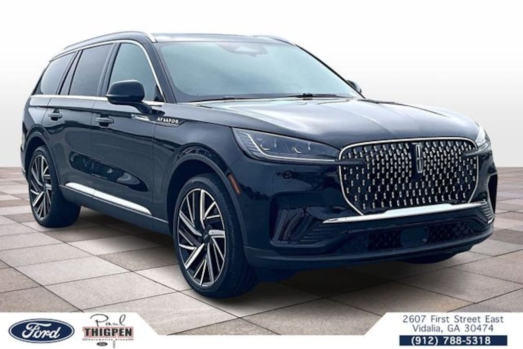 Infinite Black Metallic Clearcoat 2026 Lincoln Aviator Reserve AWD 10-Speed Automatic 3.0L V6 Vidalia Ford Lincoln 2607 E 1st St Vidalia, Georgia 30474 912-788-5318 Lincoln Connectivity Package (4-Years), 14 Speakers, 3rd row seats: split-bench, 4-Wheel Disc Brakes, 40/Mini Console/40 Dual Captain's Chairs, ABS brakes, Adaptive suspension, Air Conditioning, Alloy wheels, AM/FM radio: SiriusXM, Apple CarPlay/Android Auto, Audio memory, Auto Heated and Ventilated Driver and Passenger Seats, Auto High-beam Headlights, Auto-dimming door mirrors, Auto-dimming Rear-View mirror, Automatic temperature control, Brake assist, Bumpers: body-color, Compass, Delay-off headlights, Driver door bin, Driver vanity mirror, Dual front impact airbags, Dual front side impact airbags, Electronic Stability Control, Emergency communication system: 911 Assist, Four wheel independent suspension, Front anti-roll bar, Front Bucket Seats, Front Center Armrest, Front dual zone A/C, Front reading lights, Fully automatic headlights, Garage door transmitter, Genuine wood console insert, Genuine wood dashboard insert, Heads-Up Display, Heated door mirrors, Heated front seats, Heated steering wheel, HVAC memory, Illuminated entry, Knee airbag, Leather steering wheel, Lincoln App, Lincoln BlueCruise Equipped (4-Years Included), Lincoln Digital Experience, Low tire pressure warning, Memory seat, Navigation system: Google Maps, Occupant sensing airbag, Outside temperature display, Overhead airbag, Overhead console, Panic alarm, Passenger door bin, Passenger vanity mirror, Power door mirrors, Power driver seat, Power Liftgate, Power moonroof: Panoramic Vista Roof, Power passenger seat, Power steering, Power windows, Premium Leather Front Captain's Chairs, Radio data system, Radio: Revel Audio System with 14 Speakers, Rain sensing wipers, Rear air conditioning, Rear anti-roll bar, Rear audio controls, Rear dual zone A/C, Rear reading lights, Rear window defroster, Rear window wiper, Remote keyless entry, Security system, SiriusXM, Speed control, Speed-Sensitive Wipers, Split folding rear seat, Spoiler, Steering wheel memory, Steering wheel mounted A/C controls, Steering wheel mounted audio controls, Tachometer, Telescoping steering wheel, Tilt steering wheel, Traction control, Trip computer, Turn signal indicator mirrors, Variably intermittent wipers, Ventilated front seats, Wheels: 21" Bright-Machined Aluminum with Dark Alloy Painted Pockets, and Wireless Charging Pad.