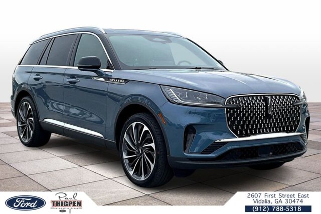 Whisper Blue Metallic Clearcoat 2026 Lincoln Aviator Reserve AWD 10-Speed Automatic 3.0L V6 Vidalia Ford Lincoln 2607 E 1st St Vidalia, Georgia 30474 912-788-5318 Lincoln Connectivity Package (4-Years), 14 Speakers, 3rd row seats: split-bench, 4-Wheel Disc Brakes, 40/Mini Console/40 Dual Captain's Chairs, ABS brakes, Adaptive suspension, Air Conditioning, Alloy wheels, AM/FM radio: SiriusXM, Apple CarPlay/Android Auto, Audio memory, Auto Heated and Ventilated Driver and Passenger Seats, Auto High-beam Headlights, Auto-dimming door mirrors, Auto-dimming Rear-View mirror, Automatic temperature control, Brake assist, Bumpers: body-color, Compass, Delay-off headlights, Driver door bin, Driver vanity mirror, Dual front impact airbags, Dual front side impact airbags, Electronic Stability Control, Emergency communication system: 911 Assist, Four wheel independent suspension, Front anti-roll bar, Front Bucket Seats, Front Center Armrest, Front dual zone A/C, Front reading lights, Fully automatic headlights, Garage door transmitter, Genuine wood console insert, Genuine wood dashboard insert, Heads-Up Display, Heated door mirrors, Heated front seats, Heated steering wheel, HVAC memory, Illuminated entry, Knee airbag, Leather steering wheel, Lincoln App, Lincoln BlueCruise Equipped (4-Years Included), Lincoln Digital Experience, Low tire pressure warning, Memory seat, Navigation system: Google Maps, Occupant sensing airbag, Outside temperature display, Overhead airbag, Overhead console, Panic alarm, Passenger door bin, Passenger vanity mirror, Power door mirrors, Power driver seat, Power Liftgate, Power moonroof: Panoramic Vista Roof, Power passenger seat, Power steering, Power windows, Premium Leather Front Captain's Chairs, Radio data system, Radio: Revel Audio System with 14 Speakers, Rain sensing wipers, Rear air conditioning, Rear anti-roll bar, Rear audio controls, Rear dual zone A/C, Rear reading lights, Rear window defroster, Rear window wiper, Remote keyless entry, Security system, SiriusXM, Speed control, Speed-Sensitive Wipers, Split folding rear seat, Spoiler, Steering wheel memory, Steering wheel mounted A/C controls, Steering wheel mounted audio controls, Tachometer, Telescoping steering wheel, Tilt steering wheel, Traction control, Trip computer, Turn signal indicator mirrors, Variably intermittent wipers, Ventilated front seats, Wheels: 21" Bright-Machined Aluminum with Dark Alloy Painted Pockets, and Wireless Charging Pad.