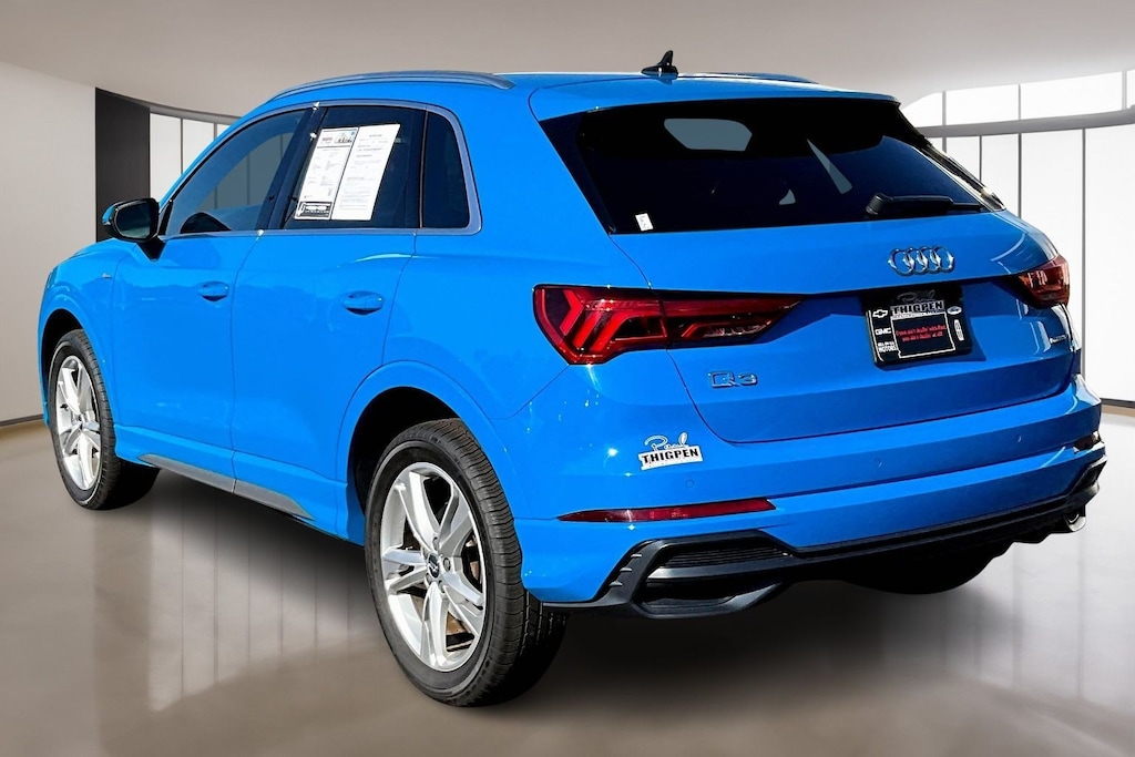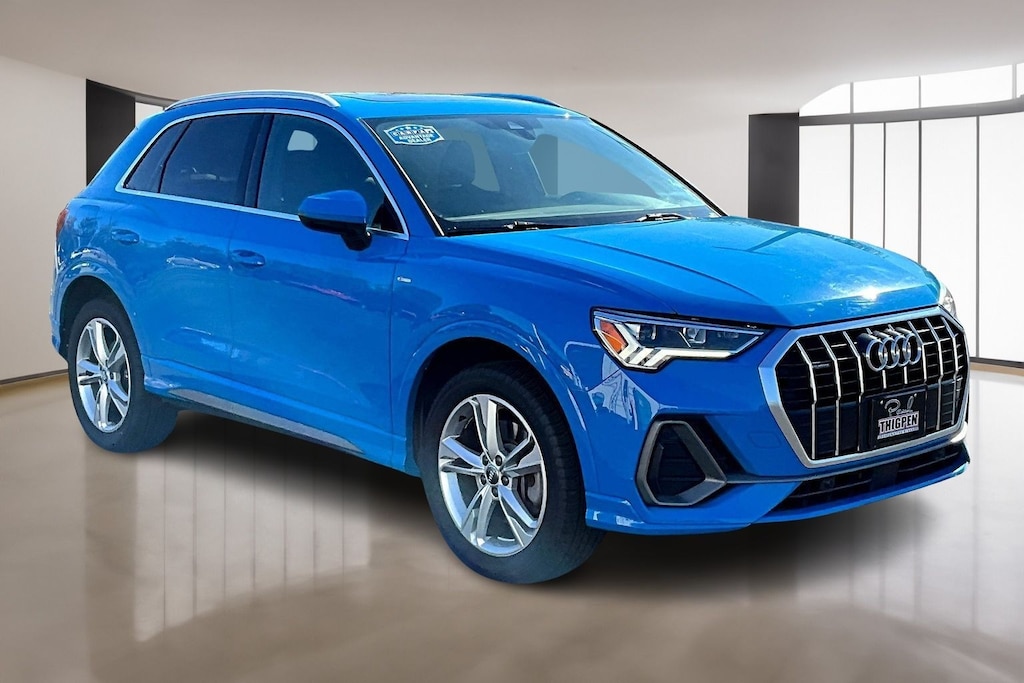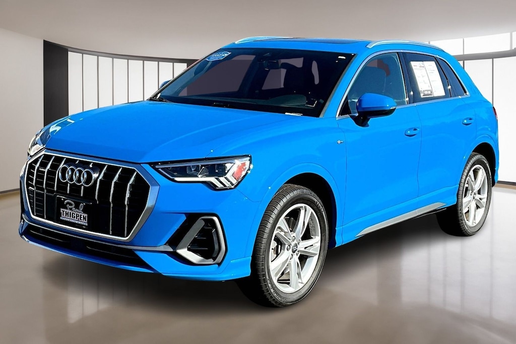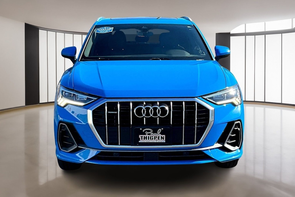 Welcome to Paul Thigpen CDJR of Waynesboro, this vehicle comes with the following Convenience Package (Alarm w/Motion Sensor, Audi Advanced Key, Audi Parking System Plus, Audi Side Assist, HomeLink Garage Door Opener, and SiriusXM All Access Service), Navigation Package (12.3" Audi Virtual Cockpit Screen, Audi Connect PRIME & PLUS, MMI Navigation Plus, and MMI Touch Response), Premium Plus Package (8-Way Power Driver & Passenger Seat, Aluminum Spectrum Inlays, Audi Phone Box w/Wireless Charging, Auto-Dimming Rear-View Mirror w/Compass, Full LED Headlights w/Unique DRL Signature, and LED Interior Lighting), Sport Interior Package (3-Spoke Multifunction Steering Wheel, Brushed Aluminum Matte Inlays, and S Line Sport Seats), Q3 Premium Plus quattro, 4D Sport Utility, 2.0L 4-Cylinder TFSI, 8-Speed Automatic with Tiptronic, quattro, Blue, Black Leather, 10 Speakers, 3.533 Axle Ratio, 4-Wheel Disc Brakes, ABS brakes, Air Conditioning, Alloy wheels, AM/FM radio, Audi Beam-Rings, Audi Guard Protection Kit, Audi smartphone interface (Apple CarPlay/Android Auto), Auto High-beam Headlights, Automatic temperature control, Bang & Olufsen 3D Sound System, Brake assist, Bumpers: body-color, Delay-off headlights, Driver door bin, Driver vanity mirror, Dual front impact airbags, Dual front side impact airbags, Electronic Stability Control, Exterior Parking Camera Rear, Four wheel independent suspension, Front anti-roll bar, Front Bucket Seats, Front Center Armrest, Front dual zone A/C, Front fog lights, Front reading lights, Fully automatic headlights, Heated door mirrors, Heated Front Bucket Seats, Heated front seats, Illuminated entry, Knee airbag, Leather Seating Surfaces, Leather Shift Knob, Leather steering wheel, Low tire pressure warning, Occupant sensing airbag, Outside temperature display, Overhead airbag, Overhead console, Panic alarm, Passenger door bin, Passenger vanity mirror, Power door mirrors, Power driver seat, Power Liftgate, Power moonroof, Power steering, Power windows, Radio data system, Radio: Audi Sound System, Rain sensing wipers, Rear air conditioning, Rear anti-roll bar, Rear fog lights, Rear reading lights, Rear seat center armrest, Rear window defroster, Rear window wiper, Remote keyless entry, Speed control, Speed-sensing steering, Split folding rear seat, Spoiler, Steering wheel mounted audio controls, Tachometer, Telescoping steering wheel, Tilt steering wheel, Traction control, Trip computer, Turn signal indicator mirrors, Variably intermittent wipers, and Wheels: 19" 5-Twin-Spoke Dynamic Design.