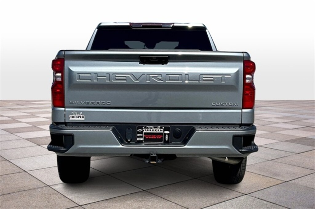 Sterling Gray Metallic 2024 Chevrolet Silverado 1500 Custom RWD 2.7L I4 Turbocharged DOHC 16V LEV3-SULEV30 310hp 4D Crew Cab, 2.7L I4 Turbocharged DOHC 16V LEV3-SULEV30 310hp, 8-Speed Automatic, RWD, 10-Way Power Driver Seat w/Lumbar, 120-Volt Bed Mounted Power Outlet, 120-Volt Interior Power Outlet, 3.5" Monochromatic Display Driver Info Center, 4-Wheel Disc Brakes, 40/20/40 Front Split-Bench Seat, 6-Speaker Audio System, ABS brakes, AM/FM radio: SiriusXM, Auto High-beam Headlights, Auto-Locking Rear Differential, Automatic Emergency Braking, Bluetooth® For Phone, Brake assist, Chevrolet Connected Access Capable, Color-Keyed Carpeting Floor Covering, Compass, Custom Convenience Package, Custom Value Package, Deep-Tinted Glass, Delay-off headlights, Dual Rear USB Ports (Charge Only), Electric Rear-Window Defogger, Electrical Steering Column Lock, Electronic Cruise Control, Electronic Stability Control, EZ Lift Power Lock & Release Tailgate, Following Distance Indicator, Forward Collision Alert, Front Center Armrest w/Storage, Front Frame-Mounted Black Recovery Hooks, Front Rubberized Vinyl Floor Mats, Front wheel independent suspension, Fully automatic headlights, HD Rear Vision Camera, Heated door mirrors, High Capacity Suspension Package, Hitch Guidance, Illuminated entry, IntelliBeam Automatic High Beam On/Off, Lane Keep Assist w/Lane Departure Warning, LED Cargo Area Lighting, Low tire pressure warning, Manual Tilt Wheel Steering Column, OnStar & Chevrolet Connected Services Capable, Outside temperature display, Overhead console, Panic alarm, Power door mirrors, Power Front Windows w/Driver Express Up/Down, Power Front Windows w/Passenger Express Down, Power Rear Windows w/Express Down, Preferred Equipment Group 1CX, Radio data system, Radio: Chevrolet Infotainment 3 System, Rear 60/40 Folding Bench Seat (Folds Up), Rear Rubberized-Vinyl Floor Mats, Rear step bumper, Remote Keyless Entry, Remote keyless entry, Remote Vehicle Starter System, Security system, Single Outlet Exhaust, SiriusXM Radio, Speed control, Speed-sensing steering, Split folding rear seat, Standard Tailgate, Theft Deterrent System (Unauthorized Entry), Tilt steering wheel, Traction control, Trailering Package, Trip computer, Variably intermittent wipers, Wheels: 20" x 9" Bright Silver Painted Aluminum, Wi-Fi Hot Spot Capable.