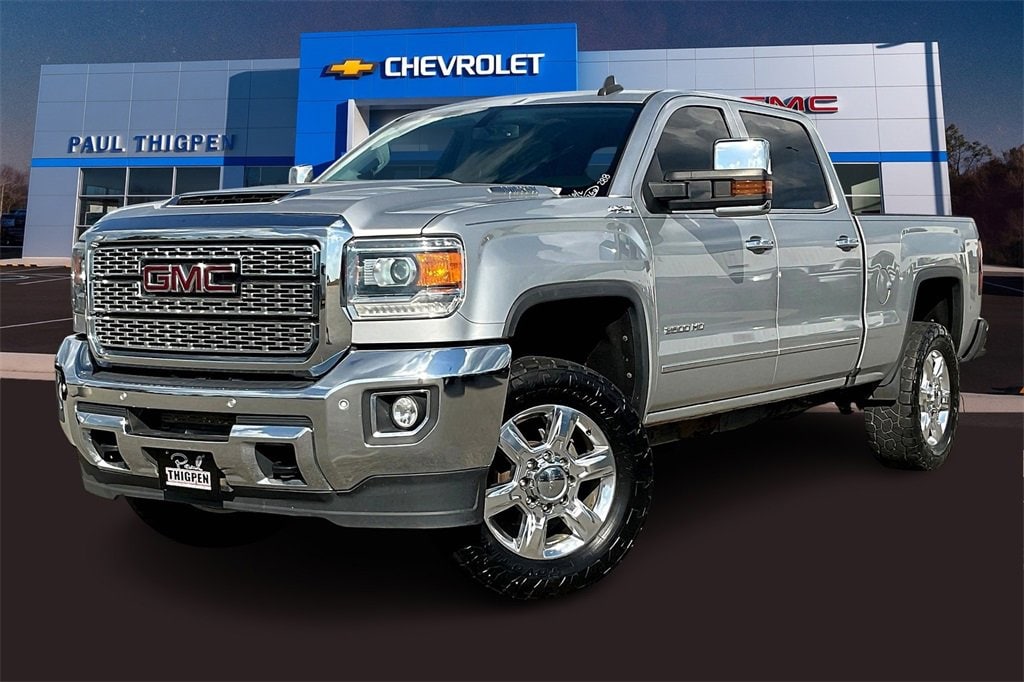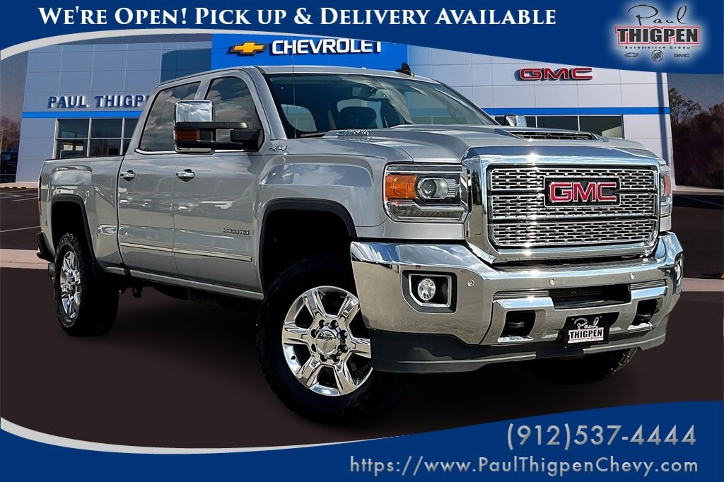Quicksilver Metallic 2019 GMC Sierra 2500HD SLT 4WD Allison 1000 6-Speed Automatic Duramax 6.6L V8 Turbodiesel **LOCAL TRADE**, Backup Camera, Bi Xenon Headlamp Package, Bose High End Sound Package, DVD Entertainment Package, Leather Seats, Memory Package, Multimedia Package, Parking Sensors, Power Mirror Package, Power Package, Preferred Equipment Package, Premium Sound Package, Remote Start, Reverse Sensing, SLT Package, Tow Package, Trailer Package, WiFi Hotspot Capable, Allison 1000 6-Speed Automatic, 4WD, Black Leather, 110-Volt AC Power Outlet, 4.2 Diagonal Color Display Driver Info Center, Adjustable pedals, Auto-dimming door mirrors, Auto-Dimming Inside Rear-View Mirror, Automatic temperature control, Bluetooth® For Phone, Bose 6 Speaker Sound System, Brake assist, Chrome Bodyside Moldings, Chrome Door Handles, Chrome Mirror Caps, Chrome Power-Adjustable Heated Outside Mirrors, Color-Keyed Carpeted Floor Mats, Color-Keyed Carpeting Floor Covering, Compass, Deep-Tinted Glass, Delay-off headlights, Digital Steering Assist, Driver & Front Passenger Vanity Mirror Visors, Dual-Zone Automatic Climate Control, Duramax Plus Package, Electric Rear-Window Defogger, Electronic Shift Transfer Case, Electronic Stability Control, Engine Block Heater, Exhaust Brake, Exterior Parking Camera Rear, Front Center Armrest w/Storage, Front dual zone A/C, Front fog lights, Front Halogen Fog Lamps, Fully automatic headlights, Garage door transmitter, GMC 4G LTE, GMC Connected Access, HD Radio, Heated door mirrors, Heated Driver and Front Passenger Seats, Heated Power-Adjustable Outside Mirrors, Heavy-Duty Handling/Trailering Suspension Package, High-Intensity Discharge Headlights, Illuminated entry, Leather Appointed Seat Trim, Leather-Wrapped Steering Wheel, LED Cargo Box Lighting, Manual Tilt-Wheel/Telescoping Steering Column, Memory seat, Navigation System, OnStar & GMC Connected Services Capable, Outside temperature display, Overhead console, Panic alarm, Power door mirrors, Power passenger seat, Power-Adjustable Heated Outside Mirrors, Power-Adjustable Pedals For Accelerator & Brake, Preferred Equipment Group 4SA, Radio: AM/FM/SiriusXM/HD w/Navigation, Rear 60/40 Folding Bench Seat (Folds Up), Rear seat center armrest, Rear step bumper, Rear Wheelhouse Liners, Remote Keyless Entry, Remote Locking Tailgate, Remote Vehicle Starter System, Security system, Single Slot CD/MP3 Player, SiriusXM Radio, Speed control, Split folding rear seat, Steering Wheel Audio Controls, Telescoping steering wheel, Theft Deterrent System (Unauthorized Entry), Tilt steering wheel, Trailer Brake Controller, Trailering Equipment, Trip computer, Turn signal indicator mirrors, Ultrasonic Front & Rear Park Assist, Universal Home Remote, Variably intermittent wipers, Wheels: 20 6-Spoke Polished Aluminum.