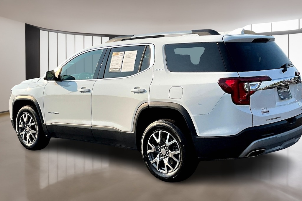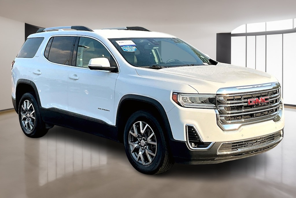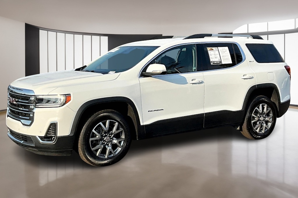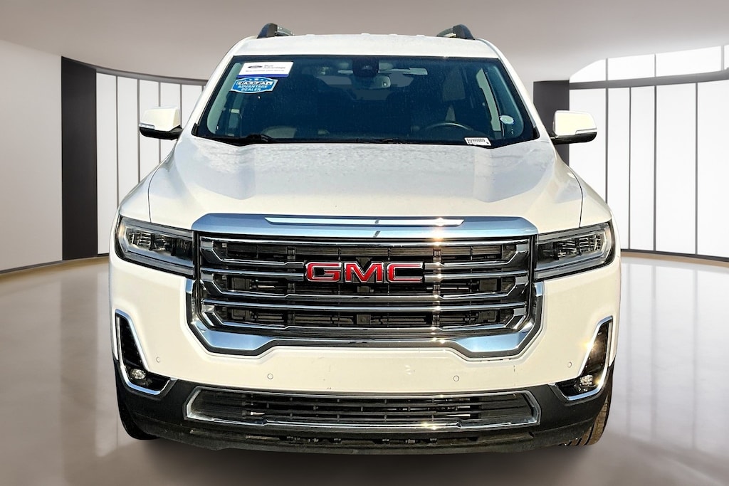 Summit White 2023 GMC Acadia SLT AWD 9-Speed Automatic 2.0L Turbocharged AWD, Jet Black Leather.