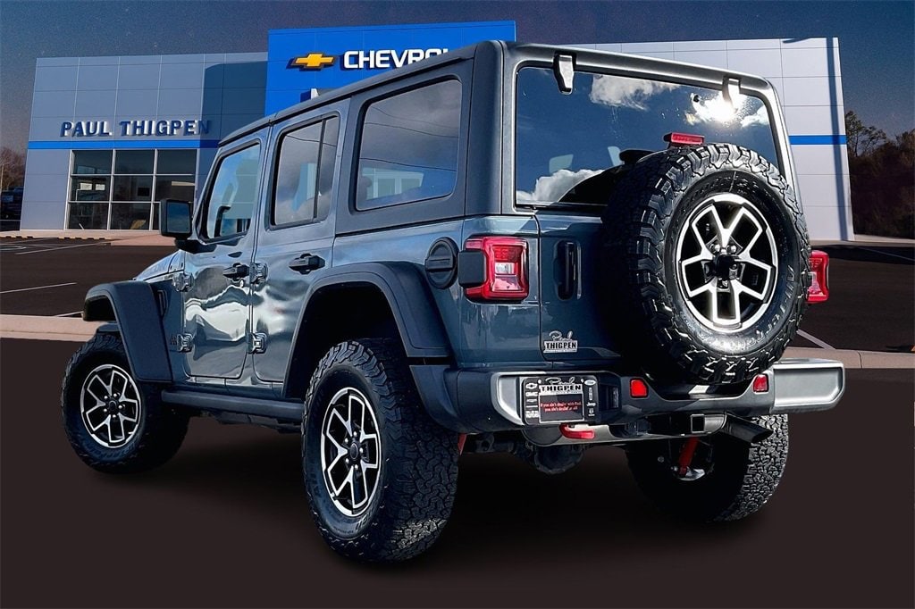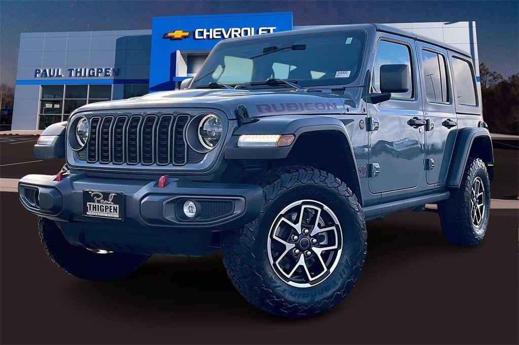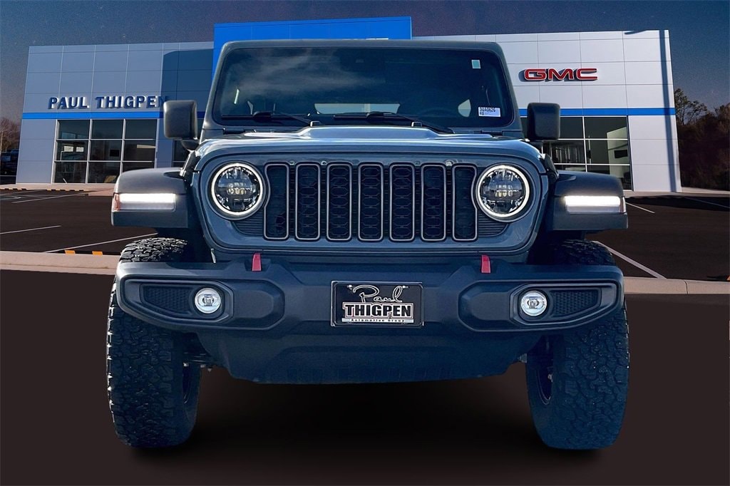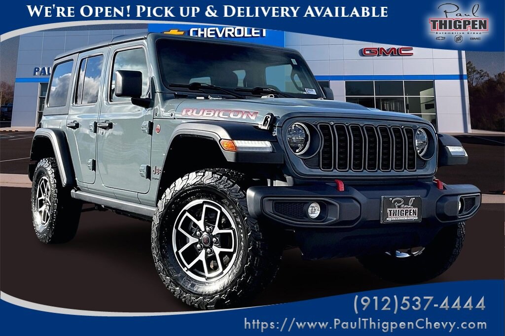 Paul Thigpen Chevrolet GMC 100 Semco Drive Vidalia, Georgia 30474 (844) 283-5935 www.paulthigpenchevy.com Paul Thigpen Chevrolet GMC has serviced and detailed this 2025 Jeep Wrangler and comes with the following Quick Order Package 22R Rubicon, 4D Sport Utility, 2.0L I4 DOHC, 8-Speed Automatic, 4WD, 4-Wheel Disc Brakes, 4G LTE Wi-Fi Hot Spot, 8 Speakers, ABS brakes, Apple CarPlay/Android Auto, Automatic temperature control, Auxiliary Switches, Brake assist, Compass, Delay-off headlights, Electronic Stability Control, Emergency communication system: Jeep Connect, Front Center Armrest w/Storage, Front dual zone A/C, Front fog lights, Fully automatic headlights, Google Android Auto, Heated door mirrors, Illuminated entry, Integrated roll-over protection, Low tire pressure warning, Outside temperature display, Panic alarm, ParkView Rear Back-Up Camera, Performance Suspension, Power door mirrors, Power steering, Power windows, Radio data system, Radio: Uconnect 5 w/12.3 Display, Rear Window Wiper/Washer, Remote keyless entry, Security system, Speed control, Split folding rear seat, Steering wheel mounted audio controls, Telescoping steering wheel, Tilt steering wheel, Traction control, Trip computer, Variably intermittent wipers, Wheels: 17 x 7.5 Machined/Painted Black, 4.10 Rear Axle Ratio, 97 MPH Vehicle Max Speed Calibration, Air Conditioning, Alloy wheels, AM/FM radio: SiriusXM, Apple CarPlay, Aux Battery, Black 3-Piece Hard Top, Class II Receiver Hitch, Cloth Low-Back Bucket Seats, Connectivity - US/Canada, Driver door bin, Driver vanity mirror, Dual front impact airbags, Dual front side impact airbags, Freedom Panel Storage Bag, Front anti-roll bar, Front Bucket Seats, Front License Plate Bracket (DISC), Front reading lights, Non-Lock Fuel Cap w/o Discriminator, Occupant sensing airbag, Overhead airbag, Passenger door bin, Passenger vanity mirror, Rear anti-roll bar, Rear reading lights, Rear Window Defroster, Stop-Start Dual Battery System, Tachometer, and VoltmeteR.